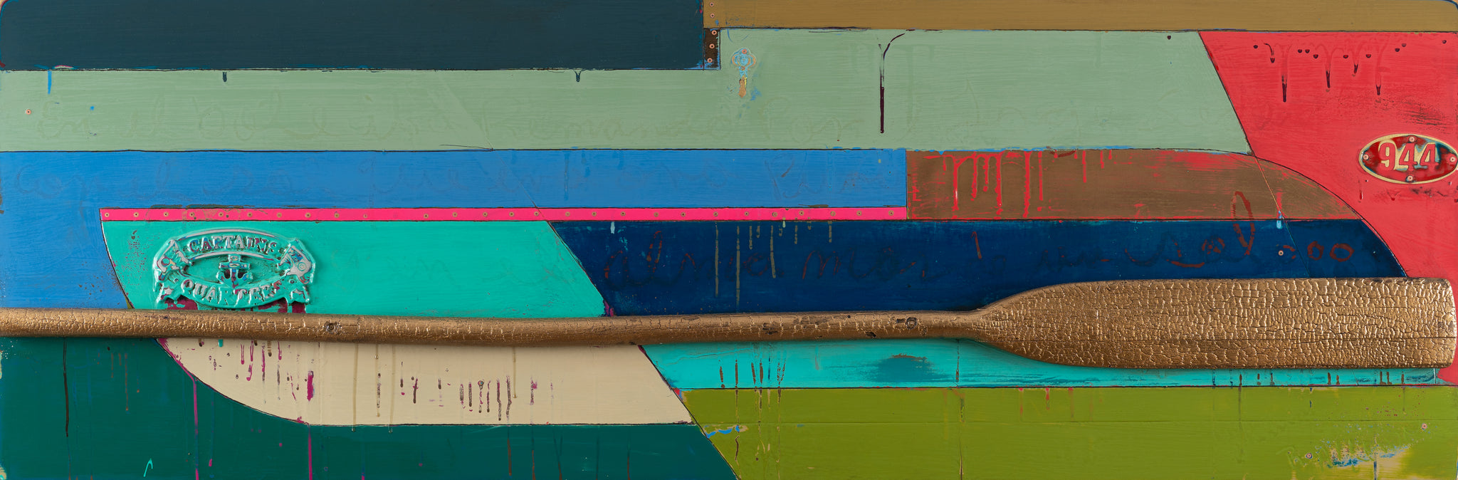 Utilizing a chisel, a traditional wood-working tool, Rey incises his drawing into the surface of his painting, providing an outline for the painting. These lines later gain further significance, either inferring the long slats used in boat-building, or creating the textured lines that remain visible in the finished work.